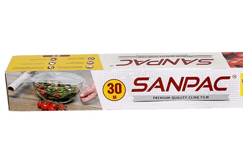 SANPAC Cling film is a thin, transparent film made from polyethylene. It is used for covering and sealing food containers to keep food fresh and prevent spills. Cling film adheres to itself and to the edges of containers, creating an airtight seal that helps to preserve the freshness of food. It is commonly used in kitchens and food service establishments for storing leftovers, wrapping sandwiches, and covering dishes. Cling film is convenient, versatile, and widely available, making it a popular choice for food storage and preservation.